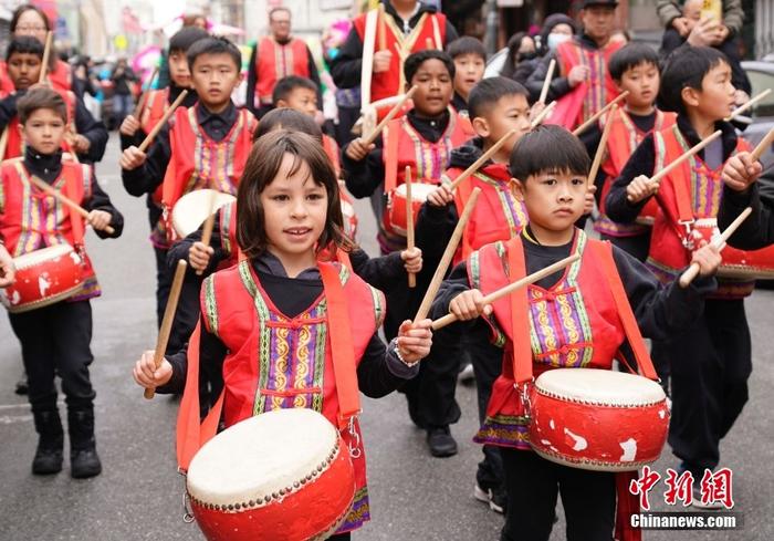 當(dāng)?shù)貢r間2月3日,一群兒童在美國舊金山唐人街春節(jié)花市上進行打鼓表演。在一年一度的舊金山唐人街春節(jié)花市上,市民和游客不但能購買到各種節(jié)日用品,還可以欣賞到舞龍、舞獅等中國民俗表演。中新社記者 劉關(guān)關(guān) 攝