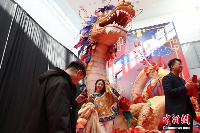 當(dāng)?shù)貢r間1月29日,加拿大多倫多,訪客在知名大型商場約克戴爾(Yorkdale)購物中心當(dāng)日揭幕的40英尺(約合12.2米)高的巨型金龍前留影。該商場稱,這是多倫多目前室內(nèi)最大龍形裝飾,并希望以此巨龍等獨特裝飾營造濃郁的農(nóng)歷甲辰龍年新春氛圍。中新社記者 余瑞冬 攝