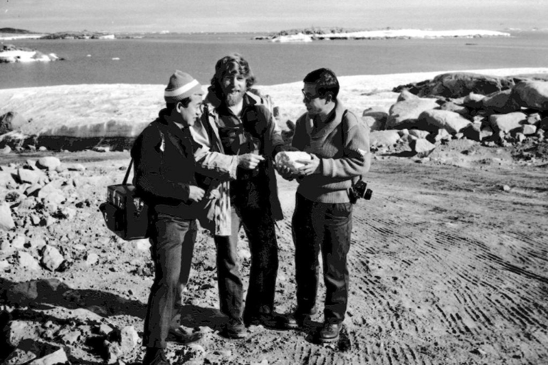 ↑董兆乾(左)、張青松(右)和澳大利亞南極局副局長(zhǎng)諾爾斯·克里博士在南極洲凱西地區(qū)考察南極巖石的分布特點(diǎn)。