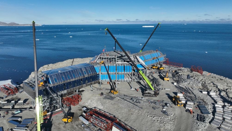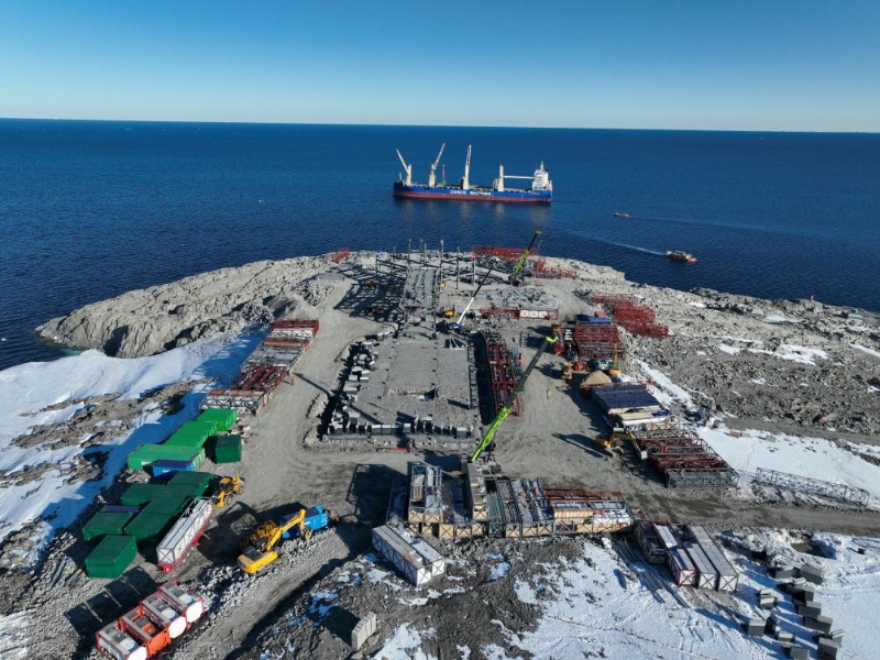↑2024年1月12日拍攝的中國(guó)南極秦嶺站建設(shè)現(xiàn)場(chǎng)。