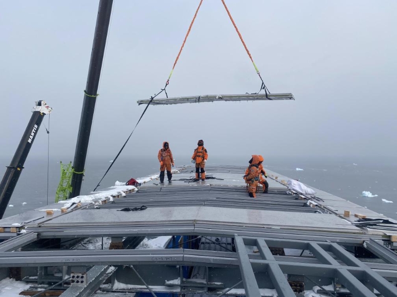 ↑2024年1月18日,中國(guó)第40次南極考察隊(duì)員在進(jìn)行秦嶺站主樓手工板的安裝。