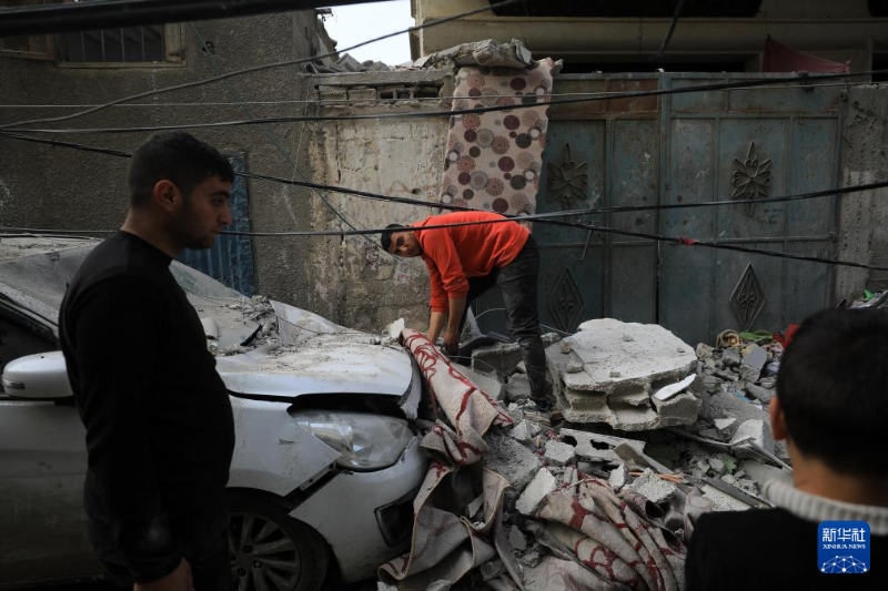2月9日,在加沙地帶南部城市拉法,人們查看以軍空襲后的受損情況。新華社發(fā)(亞西爾·庫迪攝)