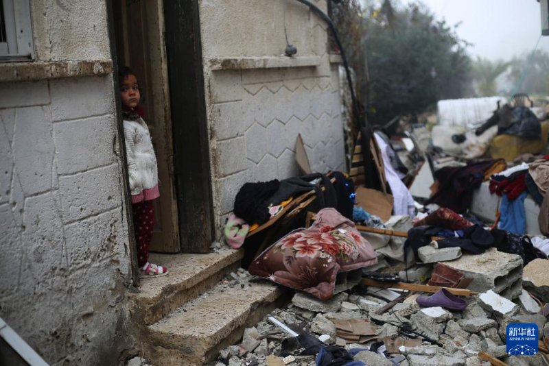2月9日,在加沙地帶南部城市拉法,一名女孩站在以軍空襲后的廢墟旁。新華社發(fā)(哈立德·奧馬爾攝)