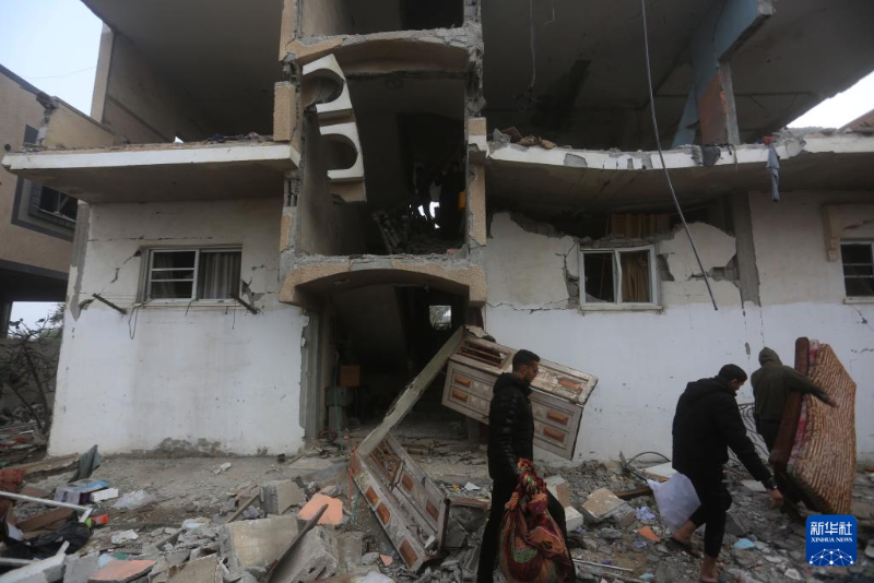 2月9日,在加沙地帶南部城市拉法,人們搬運以軍空襲后廢墟中的物品。新華社發(fā)(哈立德·奧馬爾攝)