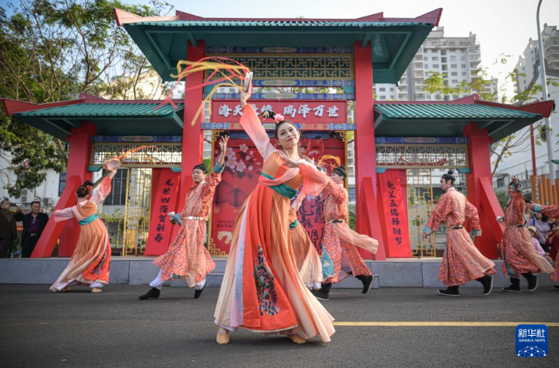 這是2月12日在位于海南省??谑械牡谑鶎萌f春會(huì)分會(huì)場——海瑞文化公園春節(jié)系列活動(dòng)中拍攝的舞蹈表演。