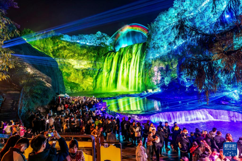 2月11日,游客在貴州省安順市觀賞黃果樹瀑布夜景。