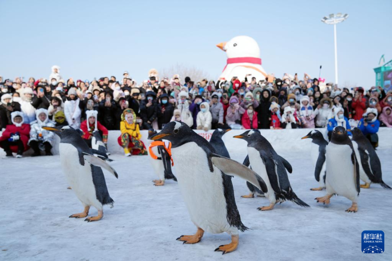 2月13日,游客在哈爾濱極地公園廣場觀看企鵝巡游。