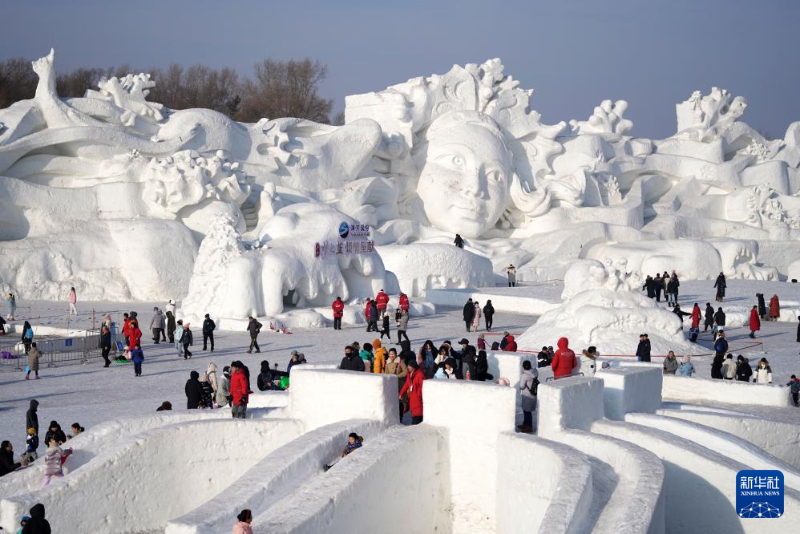 2月15日,游客在哈爾濱冰雪大世界園區(qū)內(nèi)游玩(無人機照片)。