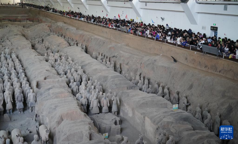 2月16日,游客在陜西秦兵馬俑一號坑遺址參觀。