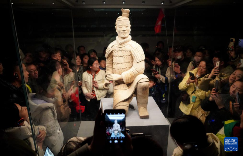 2月16日,游客在陜西秦兵馬俑二號坑遺址觀看跪射俑。
