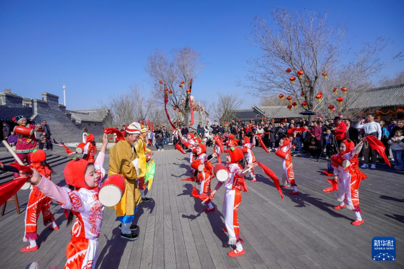 2月12日,游客在山東省棗莊市臺兒莊古城觀看社火巡游表演。