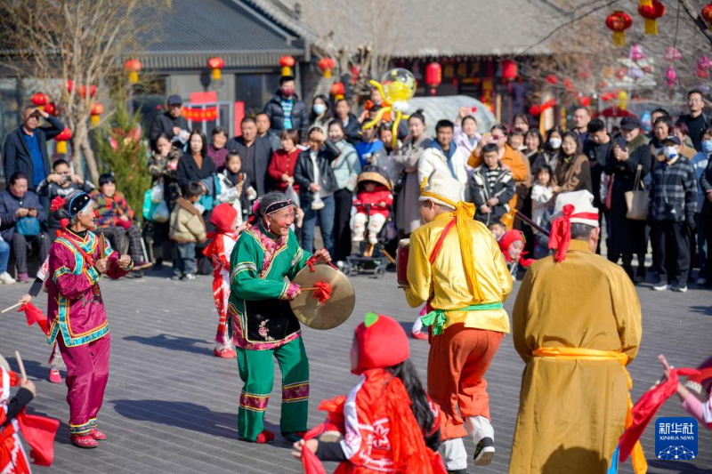 2月17日,民間藝人在山西省運城市嵐山根景區(qū)表演萬榮花鼓。