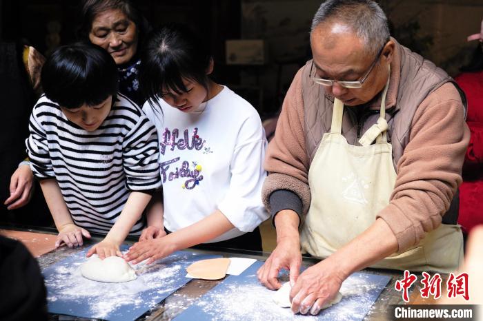 2月15日,許若俠(右一)在自己的店里指導(dǎo)游客制作面包。(徽州區(qū)委宣傳部供圖)