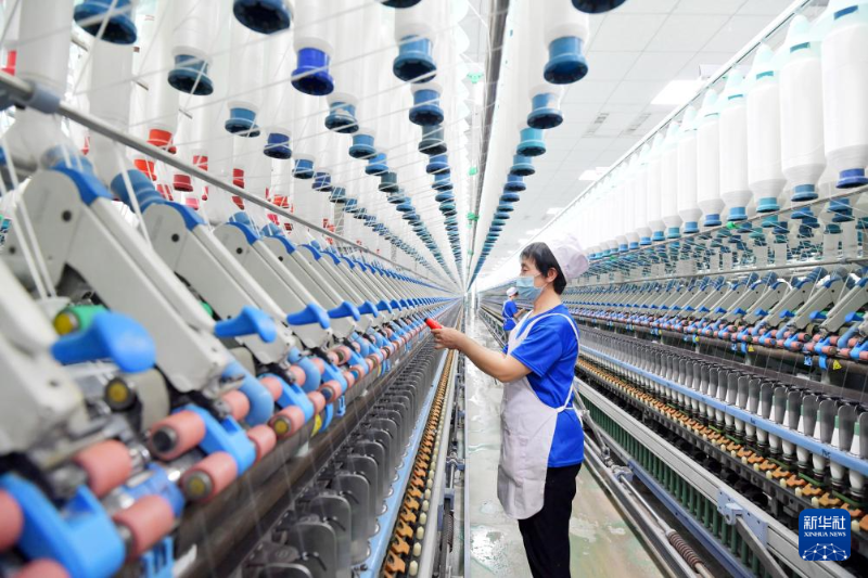 2月18日,工人在江蘇南通一家紡織企業(yè)的生產(chǎn)車間忙碌(無人機照片)。