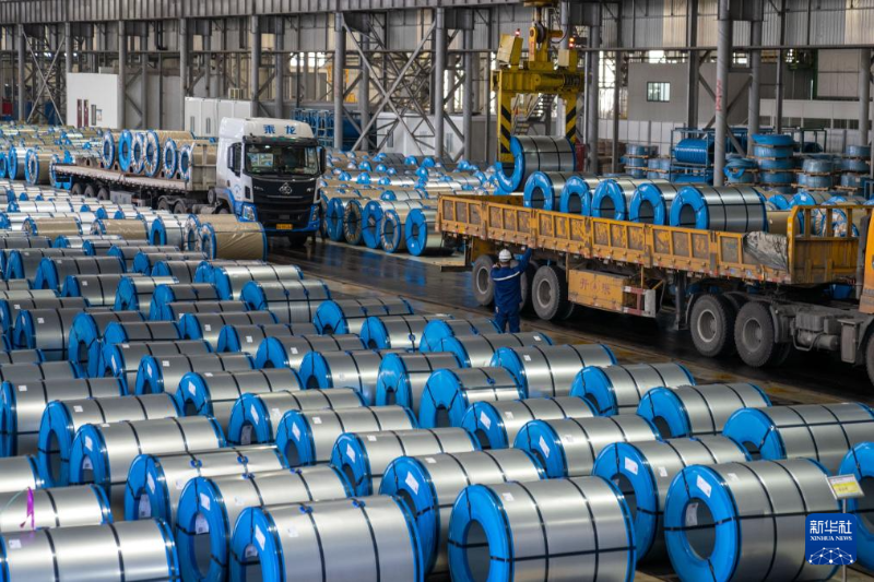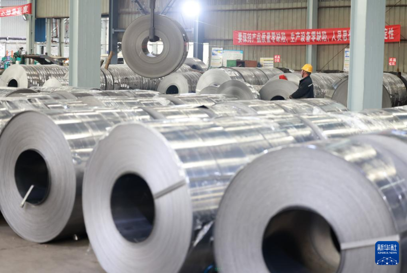 2月18日,在安徽省合肥市肥東縣一家鋼鐵企業(yè),工人操作設(shè)備吊裝成品鋼卷。
