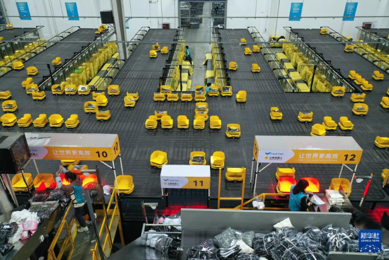 2月18日,在浙江省湖州市德清縣乾元鎮(zhèn)一家服裝企業(yè)的物流中心,分揀機器人在配送服飾(無人機照片)。