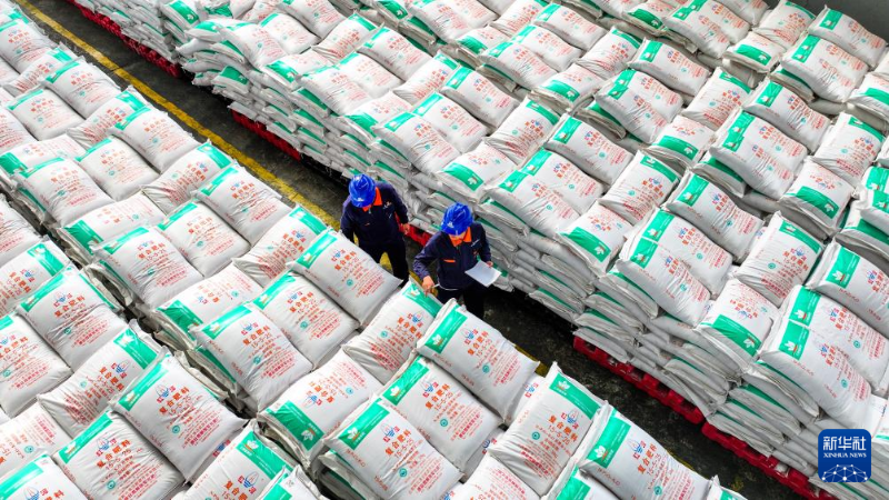 2月18日,在云南省開遠(yuǎn)市一家化肥企業(yè),倉管員在檢查化肥儲備情況(無人機照片)。