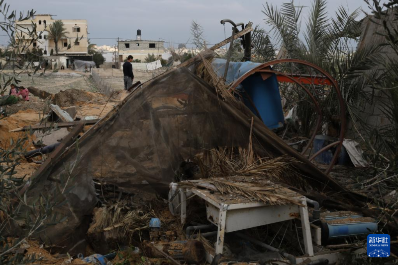 2月18日,在加沙地帶南部城市拉法,巴勒斯坦人查看以軍空襲后的損毀情況。新華社發(fā)(哈立德·奧馬爾攝)