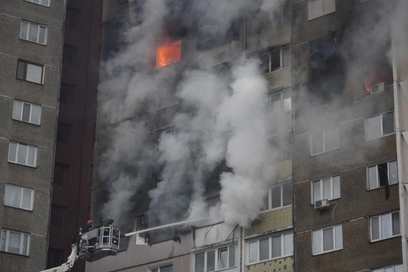 2月7日,消防員在烏克蘭基輔為被導彈碎片擊中的居民樓滅火。綜合烏克蘭各地官方消息,俄羅斯軍隊7日對烏首都基輔等地發(fā)動的新一輪空襲造成5人死亡、51人受傷。新華社發(fā)(羅曼·佩圖什科夫攝)