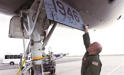 美空軍人員在一架即將退役的KC-10加油機起落架上標(biāo)注信息。