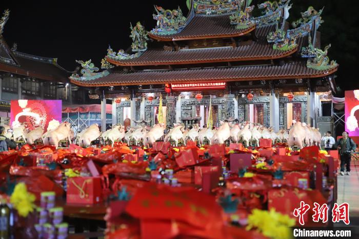 2月17日23時(shí)始,福建省漳州市薌城區(qū)天寶鎮(zhèn)珠里村玉尊宮舉行“天公誕”祭拜儀式,民眾虔誠拜天公。林妍萍 攝(來源:中新網(wǎng))