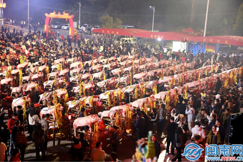 珠里村玉尊宮前的廣場上,漫天華彩,人潮如織,老老少少身著新衣持香祈福,600多張紅桌擺成方陣,五果、六齋、五牲、甜料、紅龜粿等各種貢品整齊列位,煙花香燭金紙相互輝映。