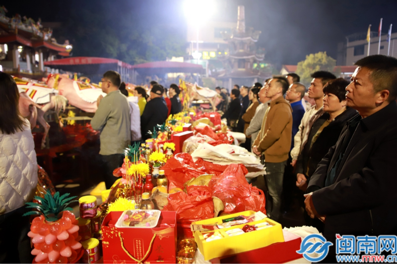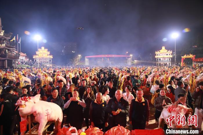 2月17日(農(nóng)歷正月初八)23時(shí),伴隨著子時(shí)的鐘聲響起,天寶鎮(zhèn)珠里村玉尊宮、臺(tái)灣宜蘭草湖玉尊宮就開始同步舉行“天公誕”祭拜儀式。兩岸民眾以同樣的方式共同“拜天公”,祈求新的一年風(fēng)調(diào)雨順,國泰民安。