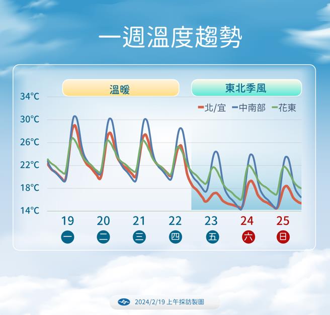華夏經(jīng)緯網(wǎng)2月20日訊:據(jù)臺(tái)灣“中時(shí)新聞網(wǎng)”報(bào)道,臺(tái)灣地區(qū)今天各地多云到晴,北部高溫26至29度,中南部達(dá)30至32度,日夜溫差大,好天氣將持續(xù)到周四(22日)白天,傍晚鋒面掠過(guò),接著東北季風(fēng)南下,北部、東半部轉(zhuǎn)雨;周五(23日)北部氣溫下降,高溫剩不到20度,周日(25日)冷空氣增強(qiáng),氣溫再降,強(qiáng)度達(dá)大陸冷氣團(tuán),下周一、二(26、27日)氣溫降到最低,部分平地下探10度。
