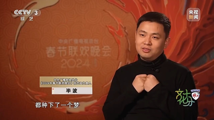 中央廣播電視總臺《2024年春節(jié)聯(lián)歡晚會》技藝組負(fù)責(zé)人 畢波:我們童年看到的很多文藝作品,其實(shí)在我們心中都種下了一個(gè)夢,過去了二三十年它開始生根發(fā)芽。研究蛟龍?zhí)柕倪@些科研人員,他們小時(shí)候也看《哪吒鬧海》,我們甚至邀請了航天員去唱這首歌,他們小時(shí)候看的是《大鬧天宮》,現(xiàn)在他們?nèi)司驮谔鞂m,這是一個(gè)多么美妙的實(shí)現(xiàn)圓夢的故事。
