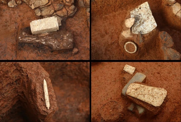 隨葬玉器出土現(xiàn)場(玉琮、玉鉞與玉環(huán)、玉錐形器、玉鉞)