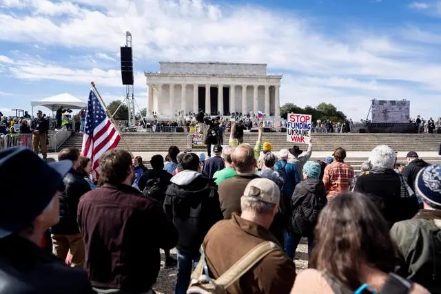 2月19日,美國(guó)上千名反戰(zhàn)人士午在華盛頓市的林肯紀(jì)念堂前舉行集會(huì),齊聲高喊。來(lái)源:新華社