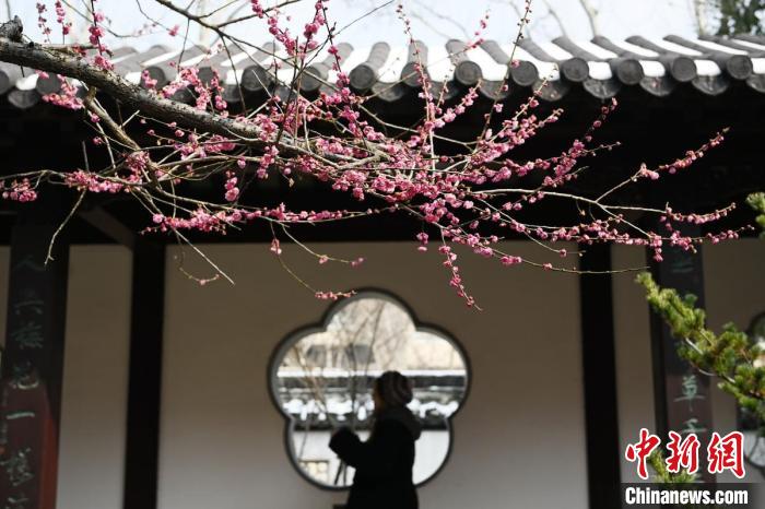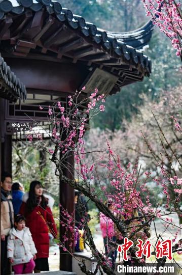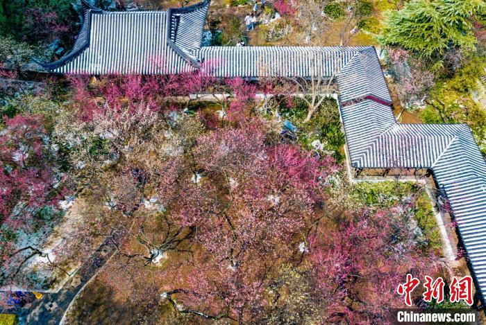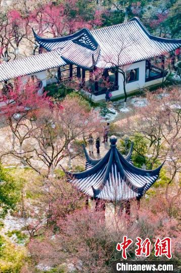 2月25日,江蘇南京,航拍雨花臺梅崗盛開的梅花,亭臺樓閣春色如畫。