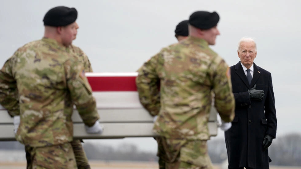 2月2日,美國總統(tǒng)拜登在特拉華州多佛空軍基地迎接在約旦無人機襲擊中死亡的美軍士兵遺體回國。(圖源:美聯(lián)社)