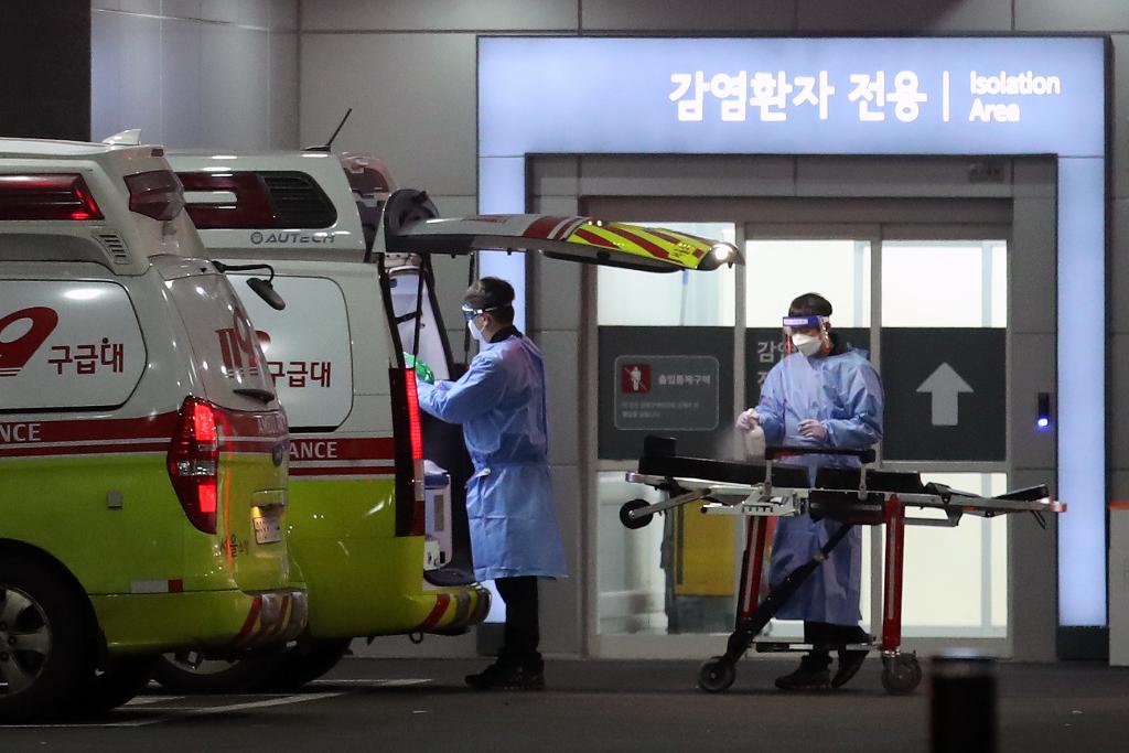 2022年3月22日,在韓國首爾,急救醫(yī)療中心醫(yī)務(wù)人員對救護車和擔(dān)架進行消毒。(圖源:新華社)