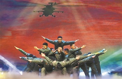 晚會當(dāng)天,直升機(jī)旋翼的轟鳴聲在一片“云海”中響起,靈動又不失剛勁的表演一氣呵成。結(jié)尾時,左右兩側(cè)光束形成交錯光網(wǎng),將眾人托舉一名“飛行員”凌云而起的動作定格。臺下響起熱烈的掌聲和叫好聲。戰(zhàn)友們對我說:“看完這個節(jié)目覺得很振奮,很自豪!”