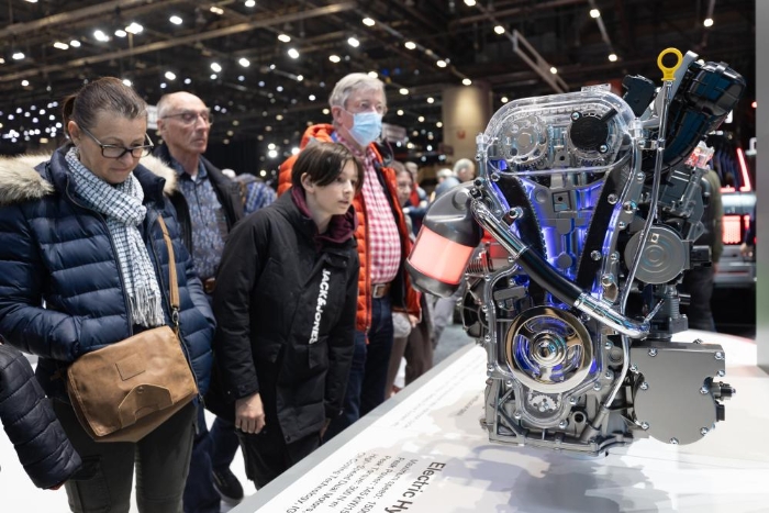 2月28日,觀眾在瑞士日內(nèi)瓦舉行的2024年日內(nèi)瓦國(guó)際車(chē)展上參觀比亞迪新款發(fā)動(dòng)機(jī)。新華社記者孟鼎博攝