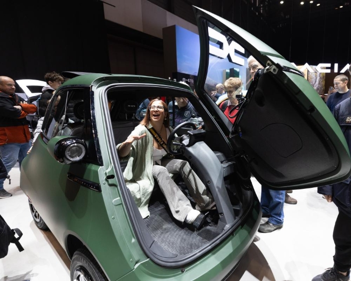 2月28日,一名觀眾在瑞士日內(nèi)瓦舉行的2024年日內(nèi)瓦國(guó)際車(chē)展上體驗(yàn)微型電動(dòng)汽車(chē)。新華社記者孟鼎博攝