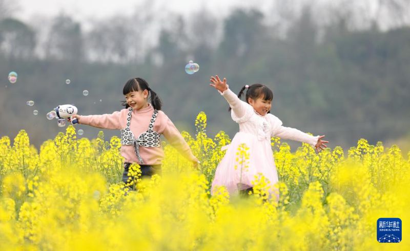 3月3日,小朋友在貴州省銅仁市玉屏侗族自治縣新店鎮(zhèn)貍獅坪村油菜花田游玩。