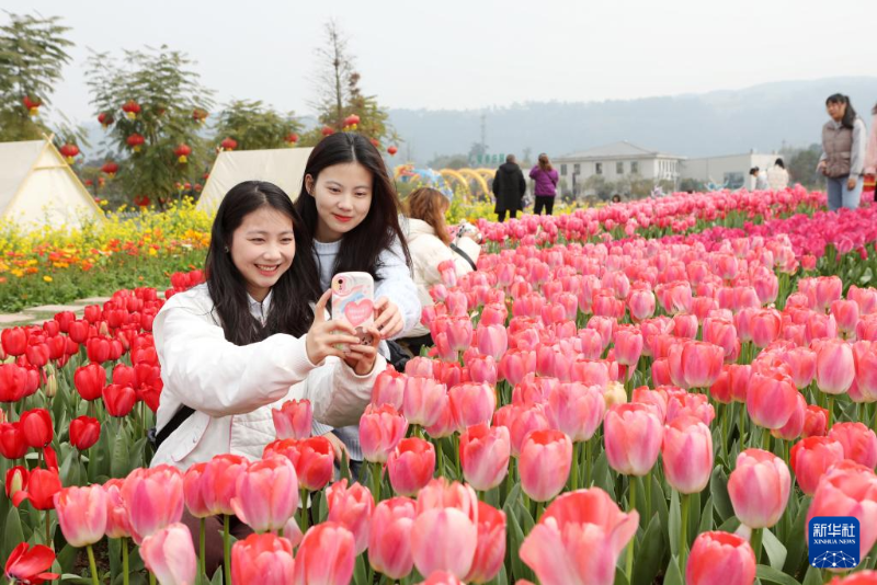 3月3日,在重慶市永川區(qū)南大街街道十里荷香景區(qū),游客在郁金香花海中拍照。