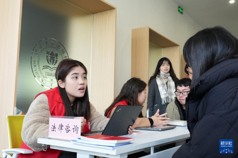 3月3日,在西南大學(xué)學(xué)生園區(qū)志愿服務(wù)活動(dòng)現(xiàn)場,大學(xué)生志愿者在給同學(xué)提供法律咨詢服務(wù)。