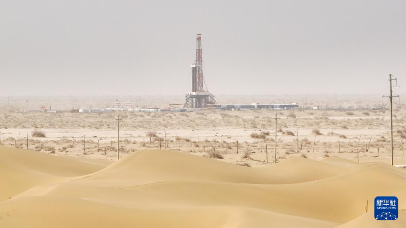 3月3日,工作人員在深地塔科1井協(xié)同機(jī)械進(jìn)行鉆井作業(yè)(無(wú)人機(jī)照片)。新華社記者 李響 攝