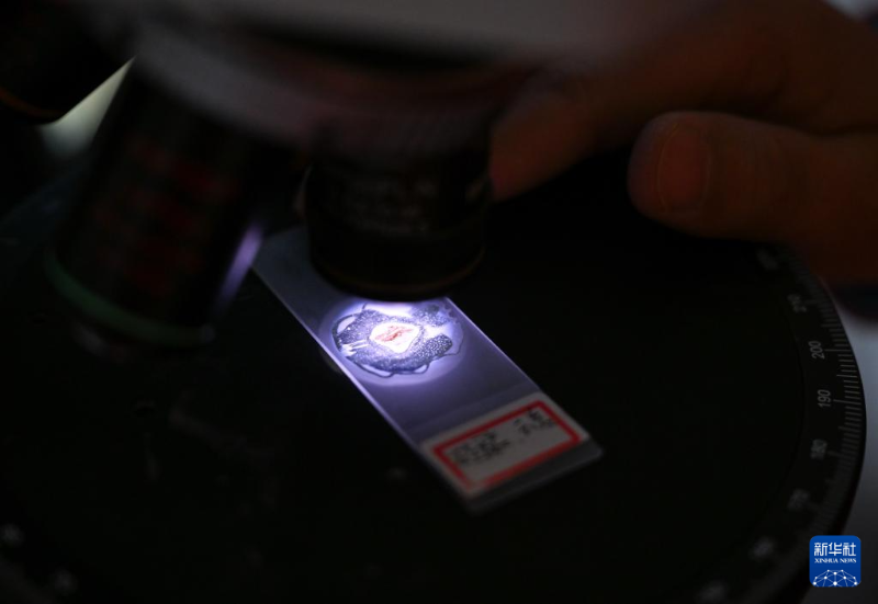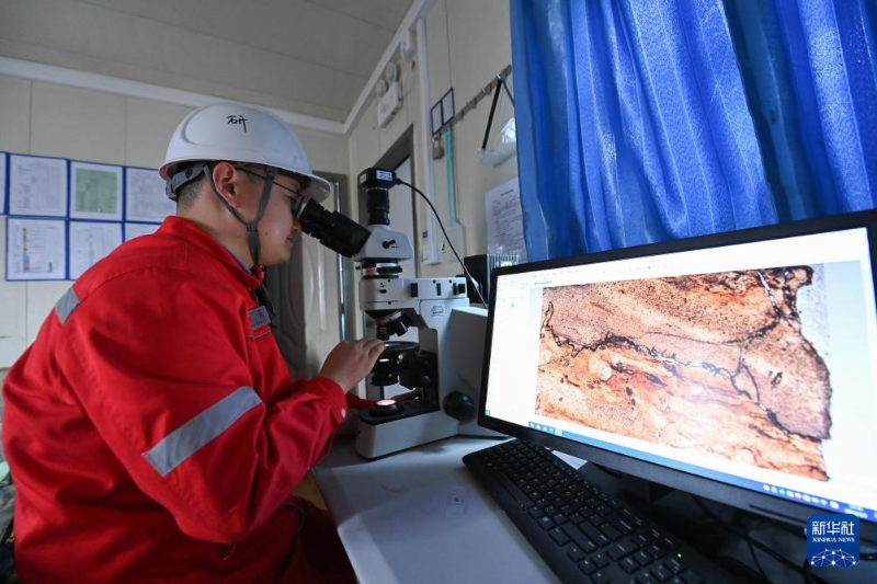 3月3日,科研人員在深地塔科1井用顯微鏡研究地底深處取上來(lái)的巖屑。新華社記者 李響 攝