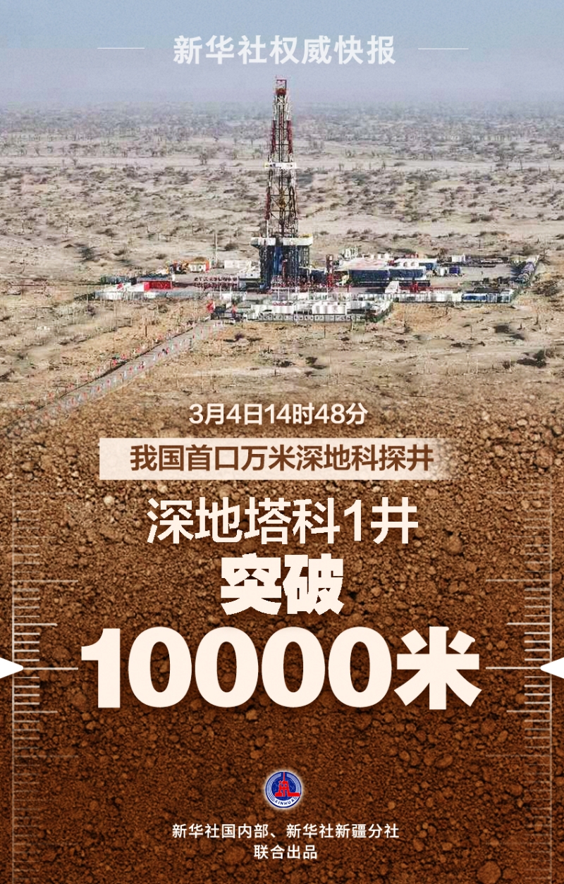 新華社烏魯木齊3月4日電(記者李響、顧煜)“9999.98,9999.99……”4日14時(shí)48分,隨著一枚金剛石鉆頭持續(xù)刺破地下巖層,中國(guó)石油塔里木油田前方指揮部電子屏幕上的數(shù)字瞬間躍至“10000.00”,我國(guó)首口萬(wàn)米深地科探井正式穿越萬(wàn)米大關(guān)。這標(biāo)志著繼深空、深海探索大自然的壯舉之后,我國(guó)在深地領(lǐng)域?qū)崿F(xiàn)重大突破。