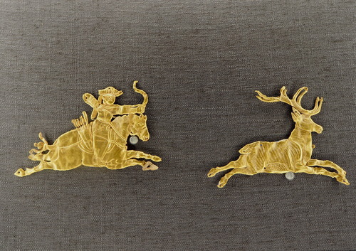 出土于青海都蘭熱水墓群的騎射形金飾片(2019年9月20日攝)。新華社記者 白瑪央措 攝
