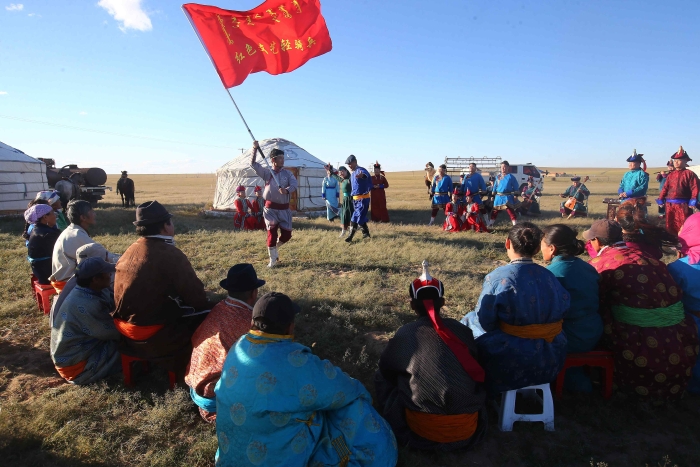 ▲烏蘭牧騎隊(duì)員為牧民演出