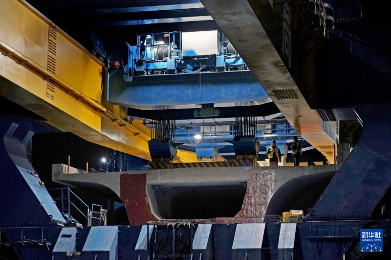 3月4日凌晨拍攝的滬蘇湖鐵路全線最后一榀箱梁架設(shè)施工現(xiàn)場。