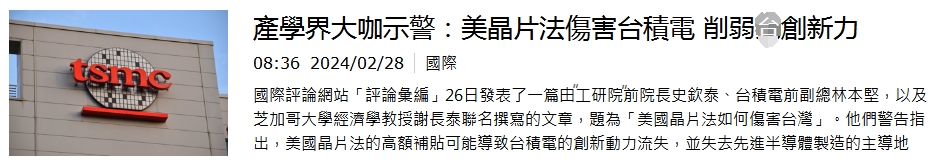 此外,美國“芯片法案”將給臺積電帶來三大風(fēng)險(xiǎn):一是臺積電若因獲得補(bǔ)貼不再關(guān)注創(chuàng)新,將失去技術(shù)優(yōu)勢;其次,臺積電對臺灣產(chǎn)能投資可能減少,降低產(chǎn)業(yè)應(yīng)對需求沖擊的韌性;第三,臺積電可能迷失方向,導(dǎo)致先進(jìn)半導(dǎo)體制造龍頭的地位拱手送人。已有許多臺灣人認(rèn)為美方試圖借“芯片法案”掌握臺企技術(shù)。
