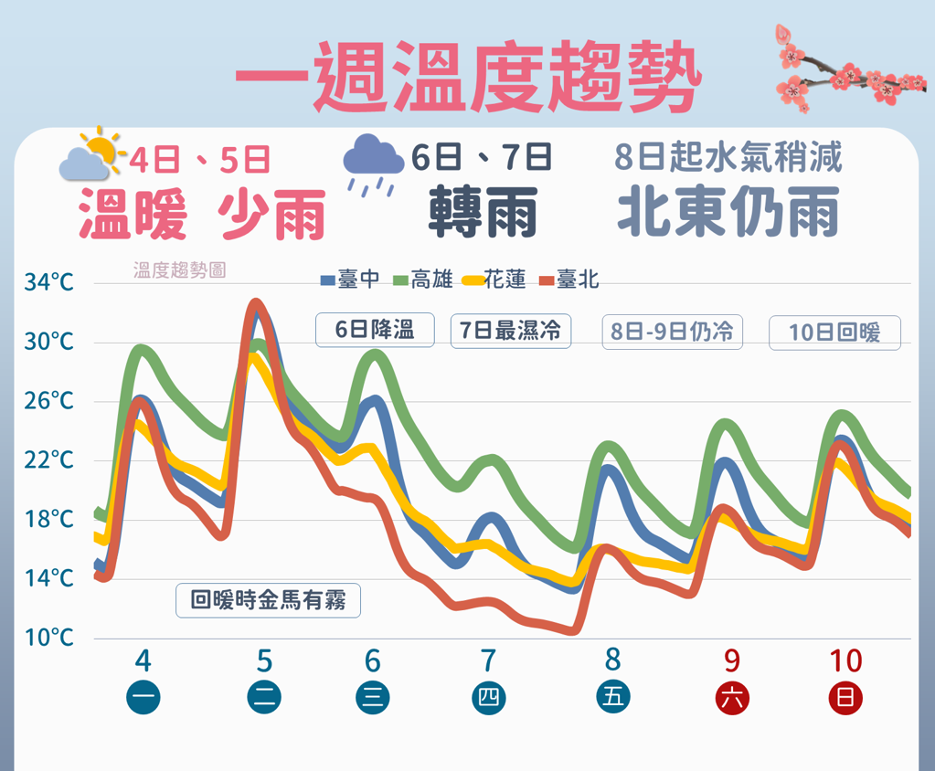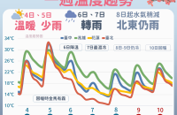 周三(6日)鋒面通過及大陸冷氣團(tuán)南下,各地有短暫陣雨,北臺(tái)灣氣溫將明顯下降,且越晚越冷,其他地區(qū)下半天起氣溫亦逐漸下降;周四北部及東半部地區(qū)有短暫陣雨,中南部地區(qū)亦仍有零星短暫陣雨,北部及東北部全天寒冷,高溫僅13至15度,其他地區(qū)氣溫也下降。