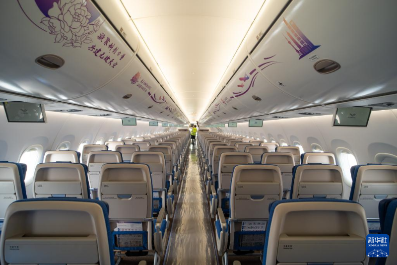 這是3月4日在老撾萬象瓦岱國際機場拍攝的C919飛機客艙。