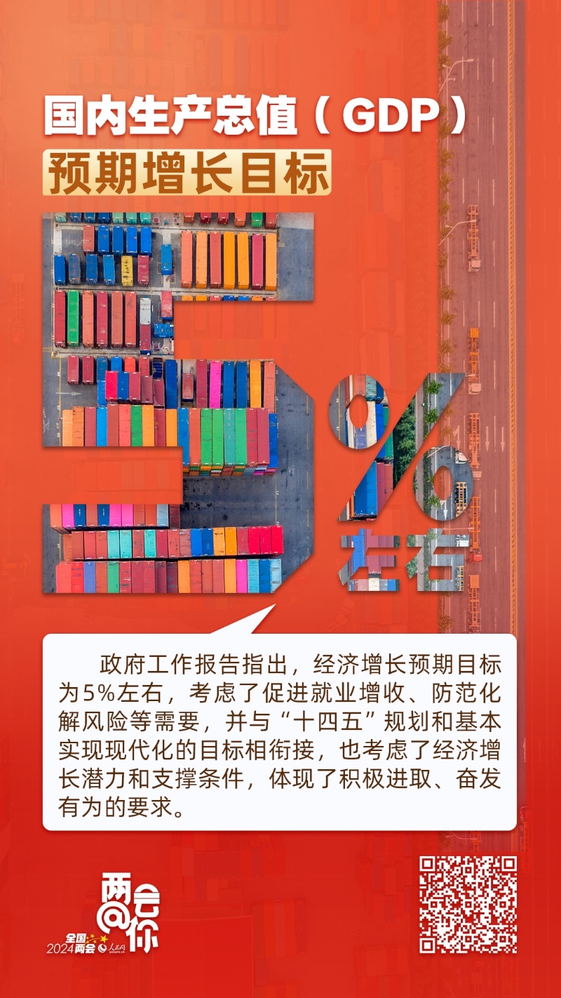 3月5日提請審議的政府工作報告(以下簡稱政府工作報告)明確,2024年的國內(nèi)生產(chǎn)總值(GDP)預期增長目標為5%左右,與去年預期增長目標相同。